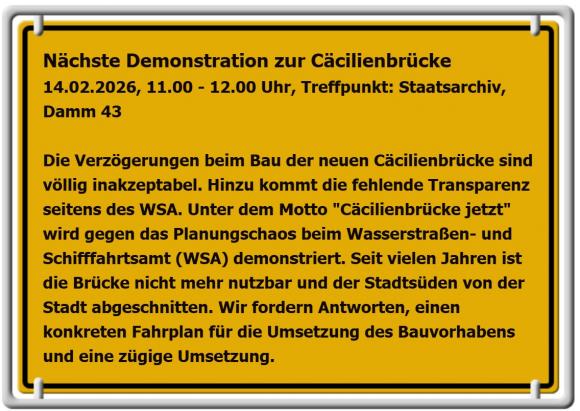 Die Verzögerungen beim Bau der neuen Cäcilienbrücke sind völlig inakzeptabel. Hinzu kommt die fehlende Transparenz seitens des WSA. Unter dem Motto „Cäcilienbrücke jetzt“ wird gegen das Planungschaos beim Wasserstraßen- und Schifffahrtsamt (WSA) demonstriert. Seit vielen Jahren ist die Brücke nicht mehr nutzbar und der Stadtsüden von der Stadt abgeschnitten. Wir fordern Antworten, einen konkreten Fahrplan für die Umsetzung des Bauvorhabens und eine zügige Umsetzung.