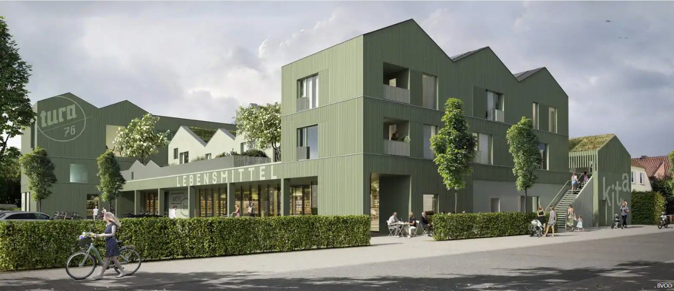 Die Marktfläche wird um ca. 300 Quadratmeter vergrößert, im Gebäudekomplex sind zudem zehn Wohnungen sowie eine Bäckerei mit Café geplant, alle Dächer werden begrünt und mit Photovoltaik ausgestattet.