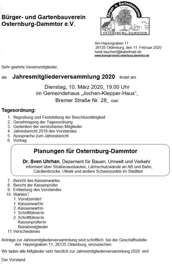 Die Jahreshauptversammlung des Bürgervereins Osternburg-Dammtor findet am 10. März 2020 im Gemeindehaus „Jochen-Klepper-Haus“ Bremer Straße 28 um 19 Uhr statt. Neben Jahresberichten und Wahlen wird Dr. Sven Uhrhan, Dezernent für Bauen, Umwelt und Verkehr über Planungen für Osternburg-Dammtor informieren.