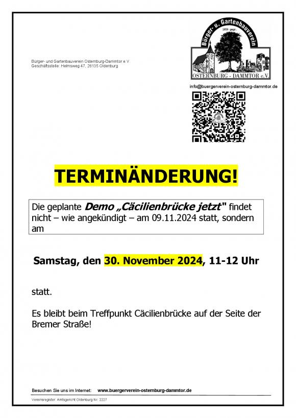 Die schlechte Nachricht aus Bremen dürfte der für diesen Samstag angekündigten Demo des Bürger- und Gartenbauvereins Osternburg-Dammtor Auftrieb geben. Der Verein will auf die Verzögerungen beim Bau der neuen Brücke unter dem Motto „Planungschaos beenden, Neubau der Cäcilienbrücke jetzt“ hinweisen. Ziel ist laut Ulf Prange (Zweiter Vorsitzender des Vereins, SPD-Landtagsabgeordneter und Ratsherr), gegenüber dem WSA Transparenz bei den Planungen und den zügigen Neubau der Brücke einzufordern. Die Teilnehmer der Demonstration treffen sich um 11 Uhr vor der Cäcilienbrücke auf der Bremer Straße und gehen im Anschluss an eine kurze Ansprache über die Behelfsbrücke zum Damm.