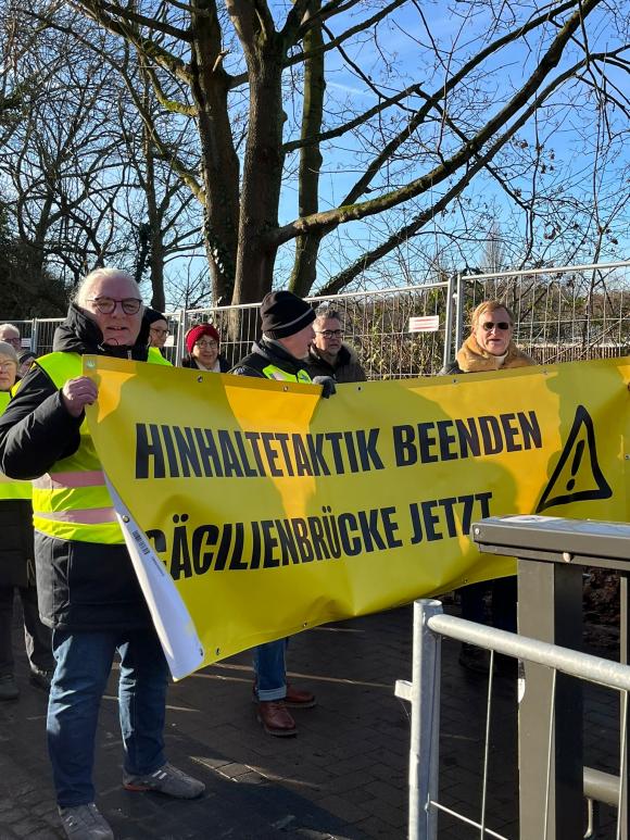 Seit vielen Jahren ist die marode Cäcilienbrücke nicht mehr nutzbar und der Stadtsüden von der Stadt abgeschnitten. Wir demonstrieren gegen weitere Verzögerungen beim Bau der neuen Brücke.